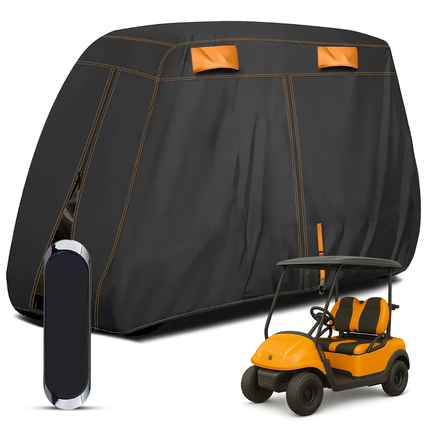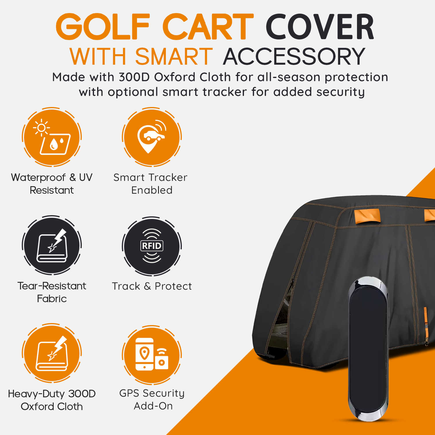 ✔ Waterproof & UV Resistant – Keep your cart protected in sun or rain ✔ Heavy-Duty 300D Oxford Fabric – Built to handle daily use ✔ Tear-Resistant Material – Long-lasting protection you can rely on ✔ Reinforced Double Stitching – Made to withstand heavy weather ✔ Waterproof Zippers – Prevent moisture seepage ✔ Elastic Hem & Buckle Straps – Snug, secure fit on most carts ✔ Smart Tracker Compatible – Add optional GPS/RFID tracking ✔ Fits Most 4-Passenger Golf Carts – 108" x 48" x 66.1"