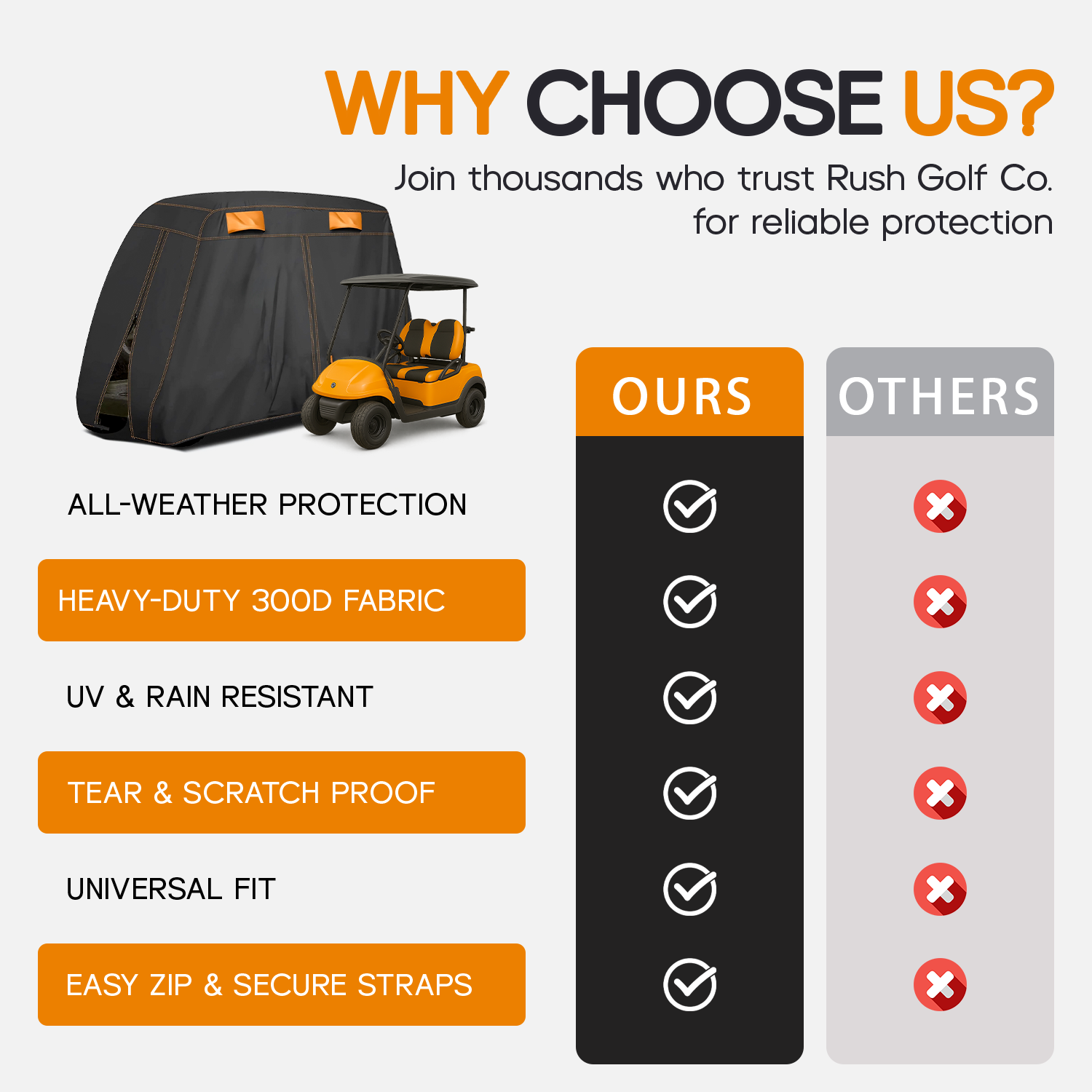 Your golf cart is an investment — protect it like one. The Rush Golf Co. Golf Cart Cover shields your cart from rain, dust, UV rays, scratches, and debris with a durable 300D Oxford exterior designed for all-season use. Whether at home, at the club, or during transport — your cart stays clean, dry, and protected.
